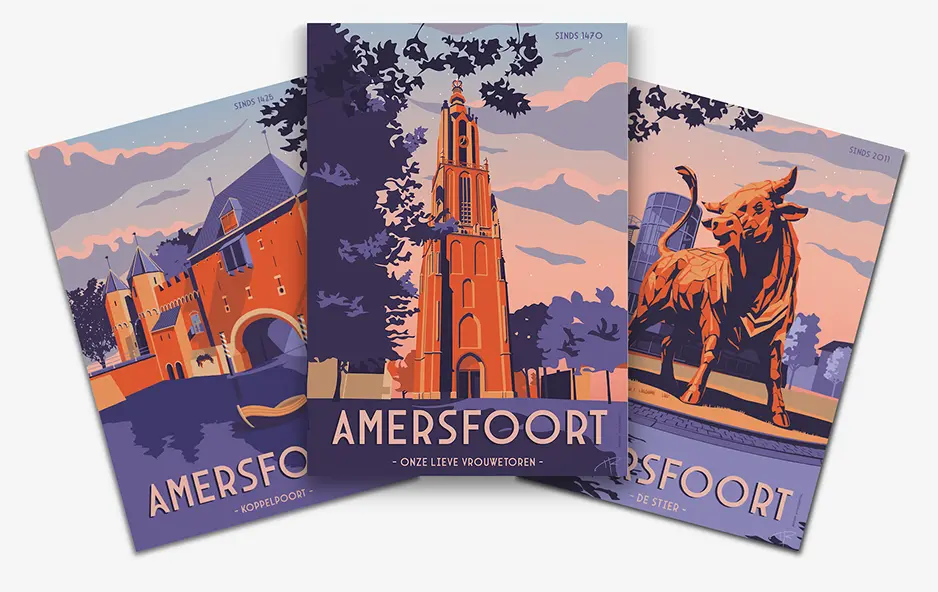 “Als kind was ik al gefascineerd door de Holland-Amerika Line posters die bij mijn oom en tante in de trapopgang hingen. Die stijl, sfeer en typografie vond ik prachtig. Dat is altijd blijven hangen. Al een tijd wilde ik iets doen met die typische stijl, maar dan voor Amersfoort. Wat begon met de Onze Lieve Vrouwetoren groeide uit tot een serie van vijf platen: 033 Vibes.